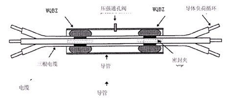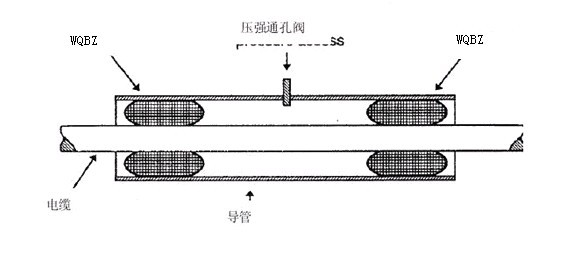 試驗設置:管道和電纜的類型和直徑按照安裝說明的要求選擇。電纜的長度根據所涉試驗實際情況進行選擇。對于壓力保持性試驗,WQBZ樣品充滿空氣,保持連接在穩定的氣壓源上。在WQBZ區域,管壁有密封膠。如下圖所示: