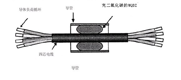 將8件WQBZ樣品安裝在短100毫米內徑PVC導管,帶一根四芯XLPE絕緣的150平方毫米1KV鋁電纜。用壓強比大氣壓高200LPa的二氧化碳氣給WQBZ樣品充氣,使測量過程中真空壓強達到300KPa(3巴)。下圖顯示所采用的試驗配置原則: