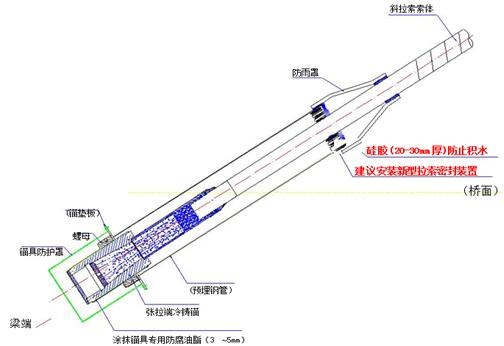 采用防雨罩+索導管出口處安裝新型拉索密封系統,與索體PE結合處采用硅膠+密封圈處理。
