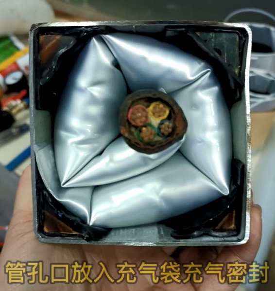 3、將充氣封堵產品圍繞電纜裝入方孔內,完成充氣過程,即完成封堵過程。