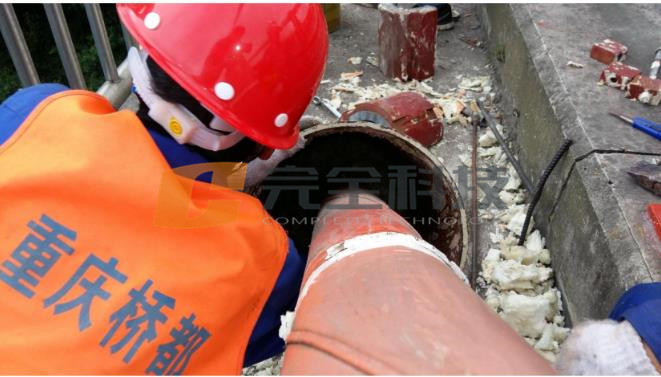 第一步,打開防雨罩,拆除減震器,對管孔內填充的發泡膠進行清除,為安裝防水密封氣囊提供條件。