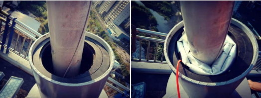 該密封系統技術對比原灌注聚氨酯發泡劑和防腐油脂的方式,最大特點和優勢體現在核心產品密封氣囊的抗震性和密封持久性。依據2018年4月頒布的湖南省地方標準《充氣型管道防水堵漏裝置》(標準編號:DB43/T 1396-2018 )顯示,密封氣囊產品經受振幅10mm頻率10Hz持續168h的震動檢測結果為合格。當對密封氣囊充氣氣壓達到2.8-3公斤時,可以把索導管內壁與拉索之間的空隙完全密封死。基于密封氣囊柔性密封的特性,橋梁拉鎖傳導的震動不會對密封氣囊造成破壞性影響,充氣后的密封氣囊始終與橋梁拉鎖和索導管形成緊密連接。并且密封氣囊的充氣孔設計在面對管道內壁,當充氣管拔除后,充氣孔處于密閉空間,不存在外露慢性漏氣的問題。因此,密封氣囊的密封有效性長達10年以上。