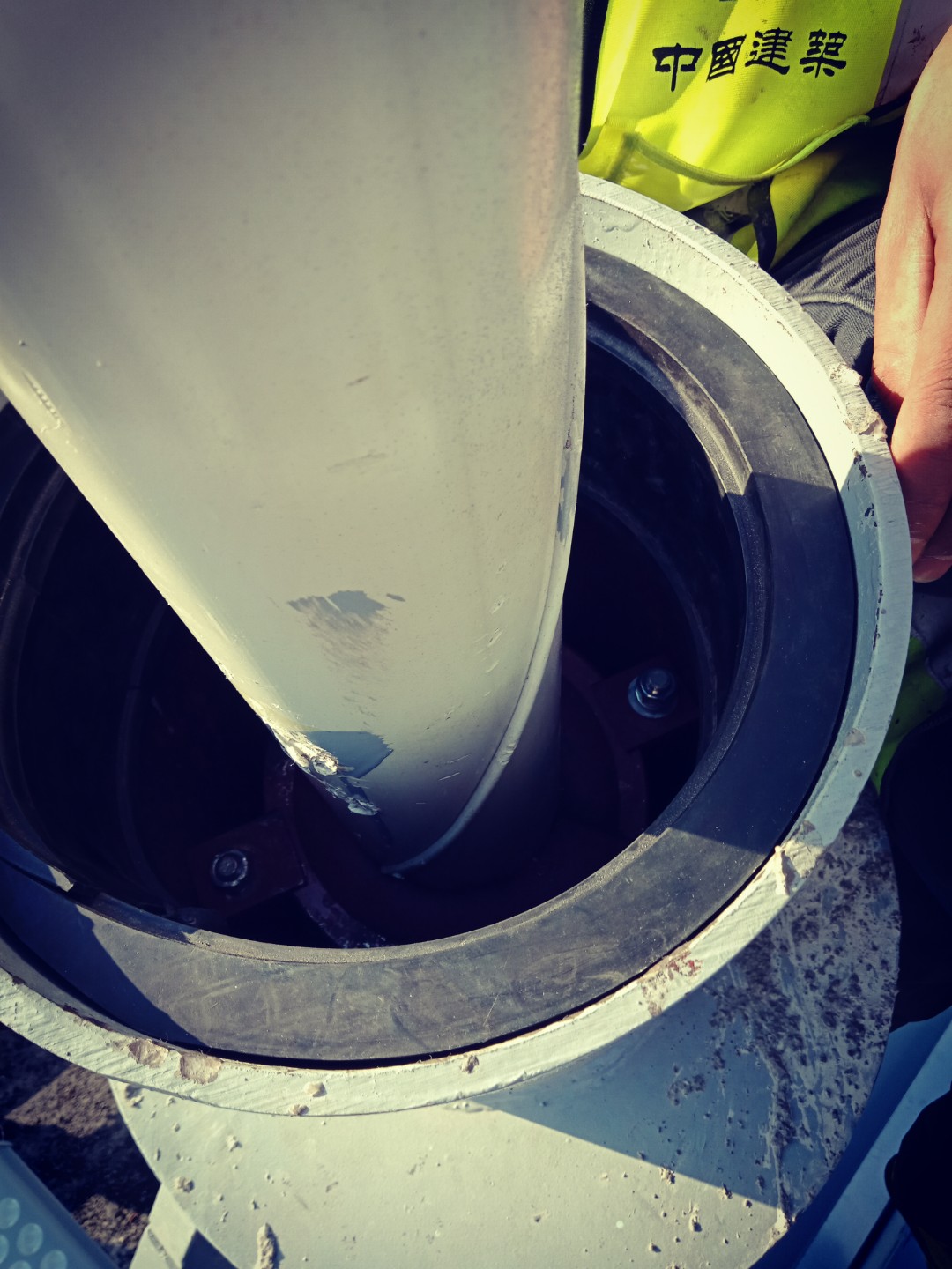 4、第三步,對外表面刮涂防腐密封膠。先用膠槍對表面打膠,再用灰鏟按壓嚴(yán)實,表面刮平整。刮涂防腐密封膠,要求表面與索導(dǎo)管口齊平,不留積水條件。