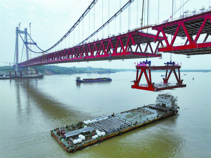 G3銅陵長江公鐵大橋在鋼梁架設過程中,綜合采用了斜拉橋和懸索橋的架梁工藝,這種斜拉—懸索協作體系橋梁具有跨度大、荷載重、剛度大的特點,這在中國橋梁施工中尚屬首次。